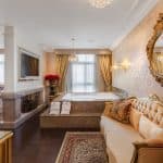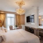 SAMRT TV 4K, cafetera NESPRESSO, con disponibilidad de tres tipos de almohadas de la línea de cama Trussardi en algodón egipcio 300 hilos, toallas 100% algodón, con muebles estilo imperial tallados a mano acompañan el equipamiento de cada suite.