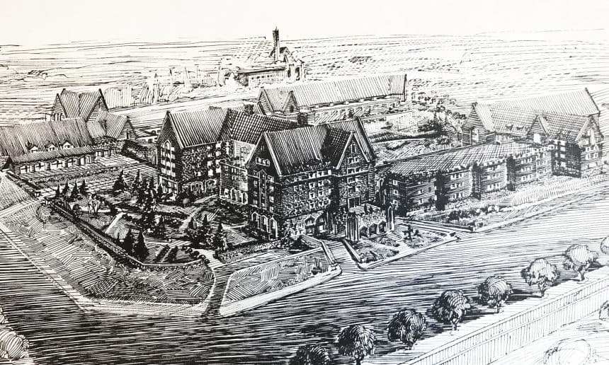 El proyecto original de 1937, hasta ahora nunca publicado. Este desarrollo pensado por los arquitectos originales del San Rafael (De los Campos, Puente y Tournier) mostraba una construcción mucho más amplia que luego fue descartada. Según este croquis la idea era efectivamente hacer del hotel un verdadero castillo Tudor.