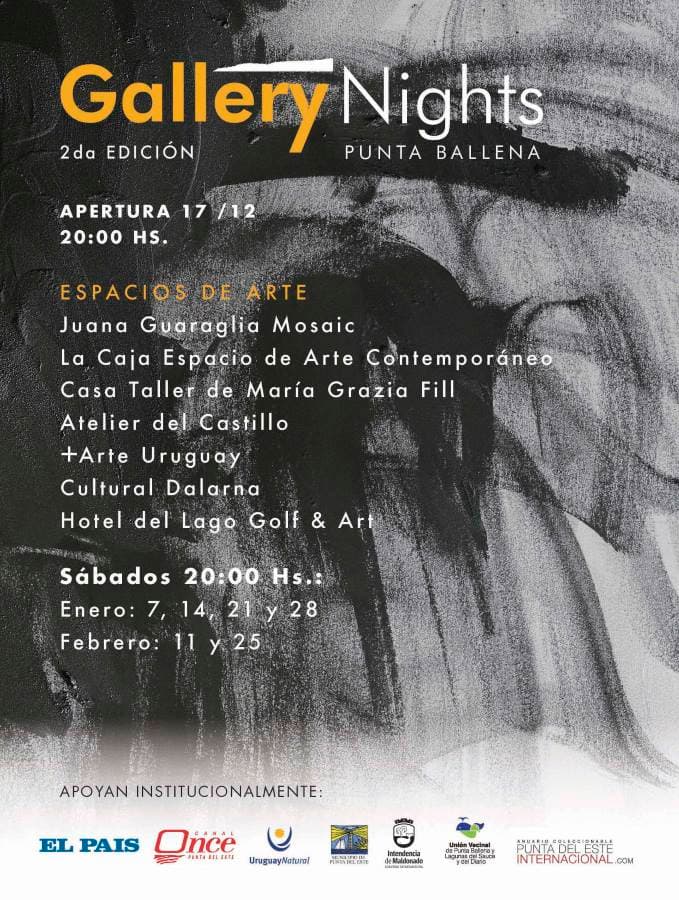 Llega la segunda edición de Gallery Nights Punta Ballena, un paseo que comienza el próximo 17 de diciembre a las 20:00 horas, a lo largo de siete espacios de arte situados en Punta Ballena. Además de la experiencia cultural y la contemplación de obras artísticas de primer nivel, este año se suma la aventura de descubrir nuevos talleres de artistas, en el poblado, en el bosque, o frente a los médanos de Chihuahua…