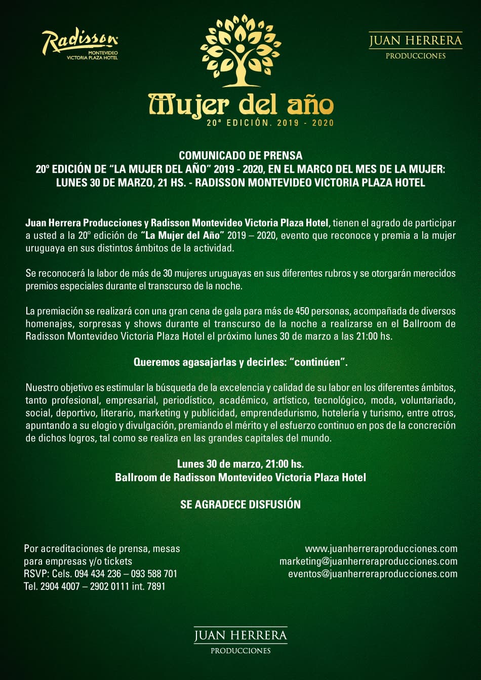 Con una cena para más de 450 personas en el Radisson Montevideo Victoria Plaza Hotel, el 30 de marzo se premiará a las mujeres se destacaron en 2019-2020. También se cumplirán dos décadas de este galardón que ya ha ganado un merecido prestigio en la escena uruguaya.
