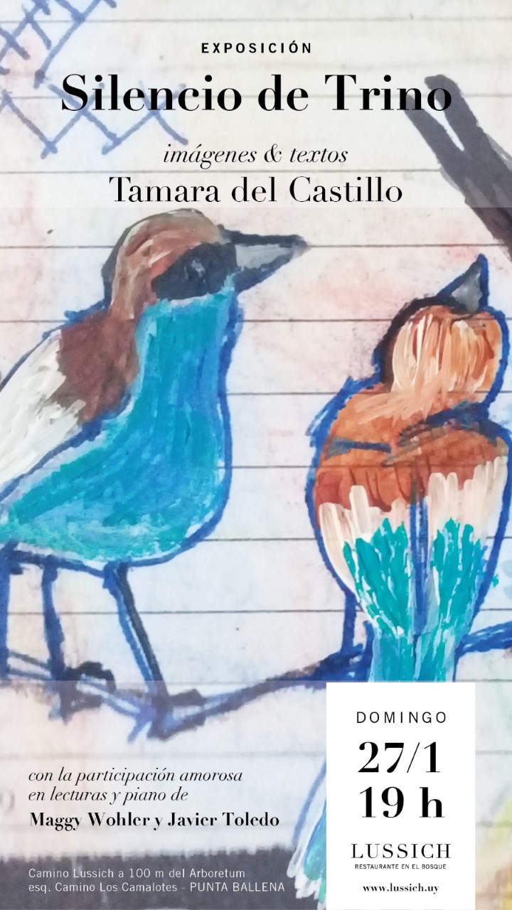 Al otro día, domingo, a las 19:00 horas Tamara del Castillo presenta «Silencio de trino» – poesía y arte visual- en Lussich (restaurante).