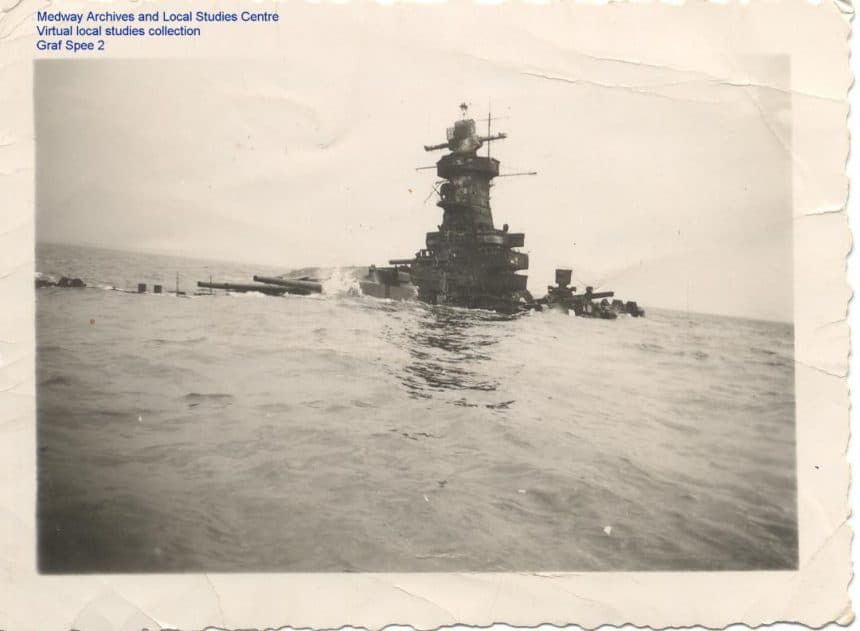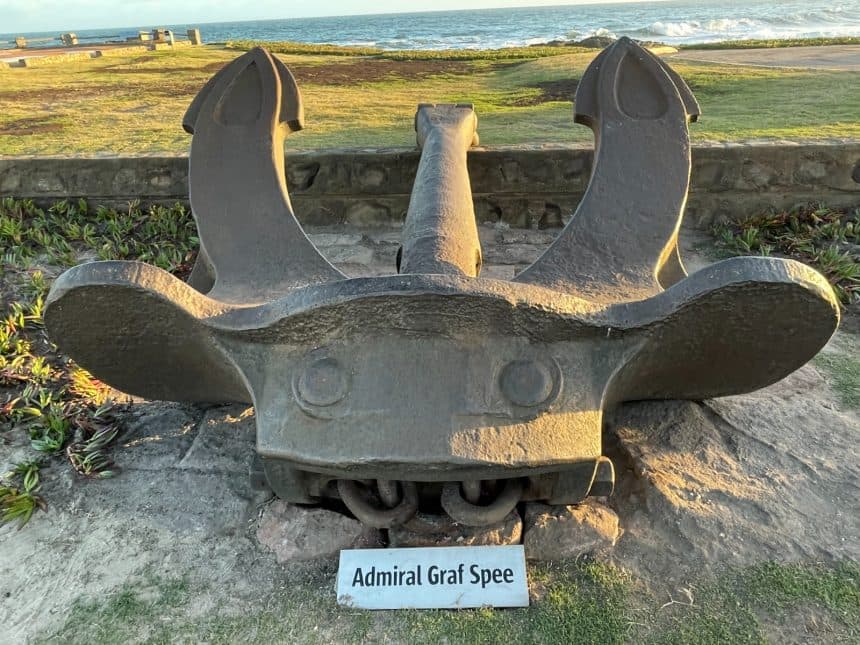 Céspedes hizo hincapié en el recuerdo del barco de bandera uruguaya “Crucero Uruguay” a cargo del capitán de fragata, Fernando Fuentes, “que tomó la iniciativa de defender con patriotismo y valor las aguas territoriales y se interpuso en la línea de fuego de los beligerantes. Hoy tenemos dos piezas importantes y emblemáticas que pertenecieron a dos de los barcos participantes: el ancla del Graf Spee y el ancla auxiliar del HMS Ayax”.