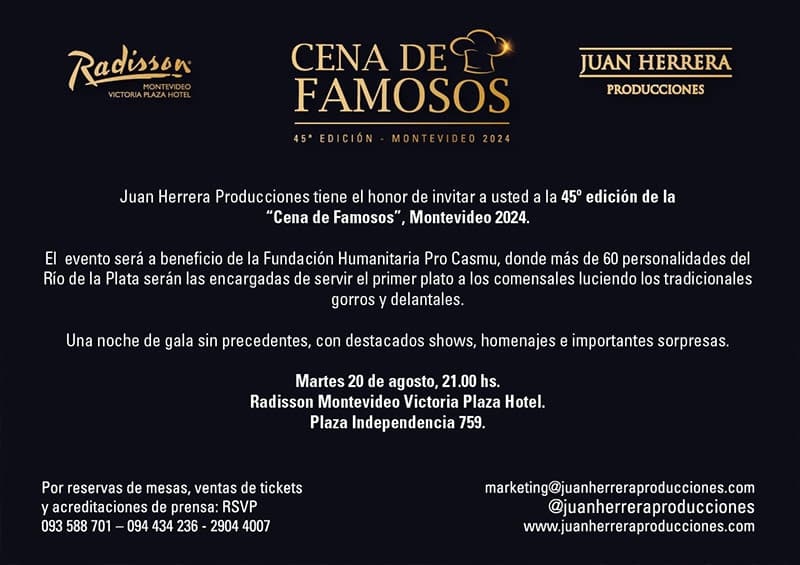 Juan Herrera Producciones organizará la 45ª edición de la «Cena de Famosos» en Montevideo, un evento solidario de gran renombre en la sociedad uruguaya. Esta edición tendrá lugar el martes 20 de agosto a las 21:00 horas, en el ballroom del Radisson Montevideo Victoria Plaza Hotel.