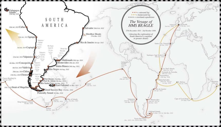 En 1831, el científico embarcó en Inglaterra como naturalista en el bergartín capitaneado por Robert Fitz Roy.