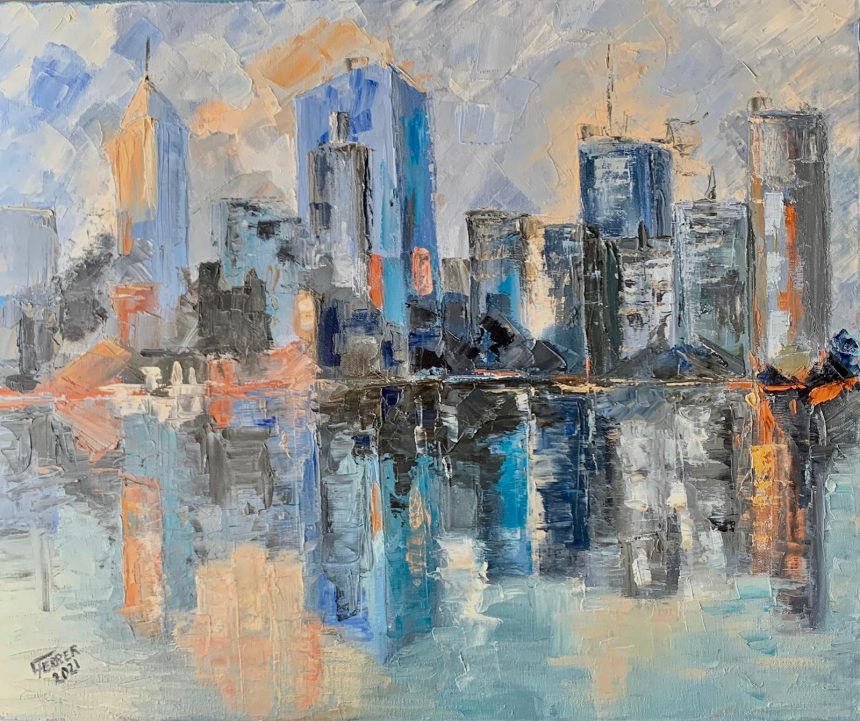 Desde muy chica comenzó a dibujar, a bocetar imágenes en un cuaderno. Tenía, ya en la niñez, la necesidad de plasmar una obra, aunque posiblemente todavía no estaba consciente de esto. «Toda mi vida amé el arte en todo su contexto. Admiro las esculturas, las pinturas e incluso adoro la arquitectura. ¿Cuándo comenzó?, no tengo idea, porque soy de las que anda por la calle mirando hacia arriba, viendo fachadas, mirando cada pequeño detalle», dice, a modo de introducción, la artista plástica Claudia Ferrer. Y agrega: «Tuve la oportunidad de ver grandes y pequeñas ciudades del mundo y en cada una maravillarme, de entrar a los mejores museos del mundo y no dejar de asombrarme, de ir a hermosas ciudades antiguas con sus palacios, mezquitas, catedrales, parques, de ir a miles de iglesias y a cementerios y poder admirar su arte y su arquitectura, sus pinturas. Amo la pintura y el mar, que para mí es una obra maestra de la naturaleza y me gusta poder reflejar en mis obras lo que voy viendo y admirando. En fin creo que nací maravillándome con el arte. Y tratando de aprender sobre él».