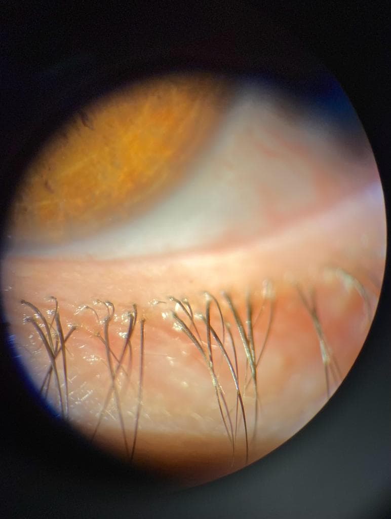 Otro de los casos típicos de ojo seco es una especie de «caspita» en las pestañas. Esto es debido a un parásito, el Demodex folicullorum, que se alimenta de la grasa del folículo piloso de las pestañas y que se reproduce sin parar. Lo que suele provocar es conjuntivitis crónica, bordes palpebrales con secreción permanente y disconfort visual que se conoce como Blefaritis. Una vez detectado el parásito en una pestaña, se trata específicamente con un anti parasitario y el lavado periódico del borde de la pestaña.