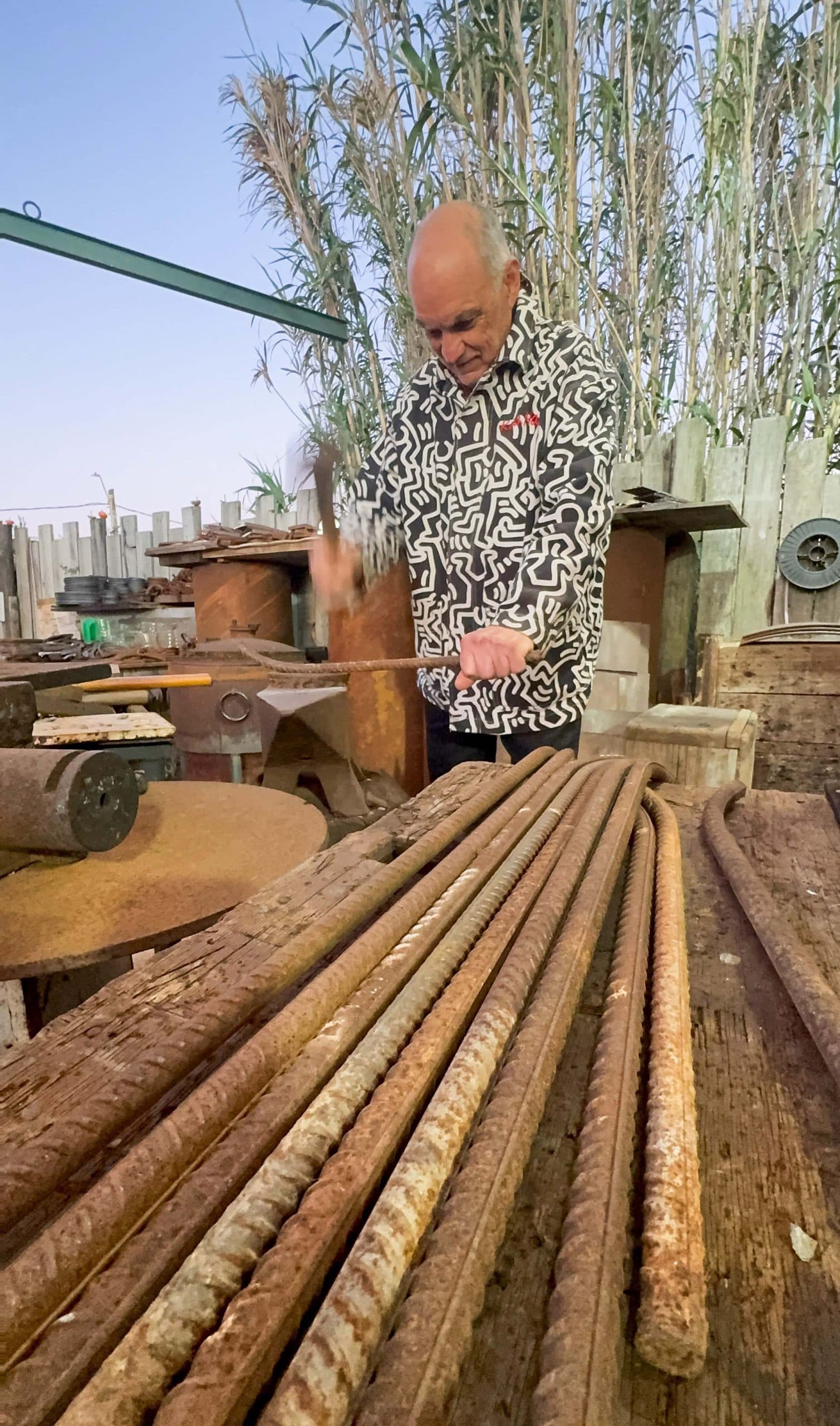 Esa conexión energética guía su serie más reciente, El descanso de los guerreros, inspirada en los escudos romanos y en la búsqueda de paz interior. “La paz es el descanso de los guerreros”, repite. Cada obra está hecha con hierro reciclado, proveniente de viejas estructuras, ascensores y barcos: metales que alguna vez tuvieron otra vida y que hoy respiran de nuevo bajo su fuego.