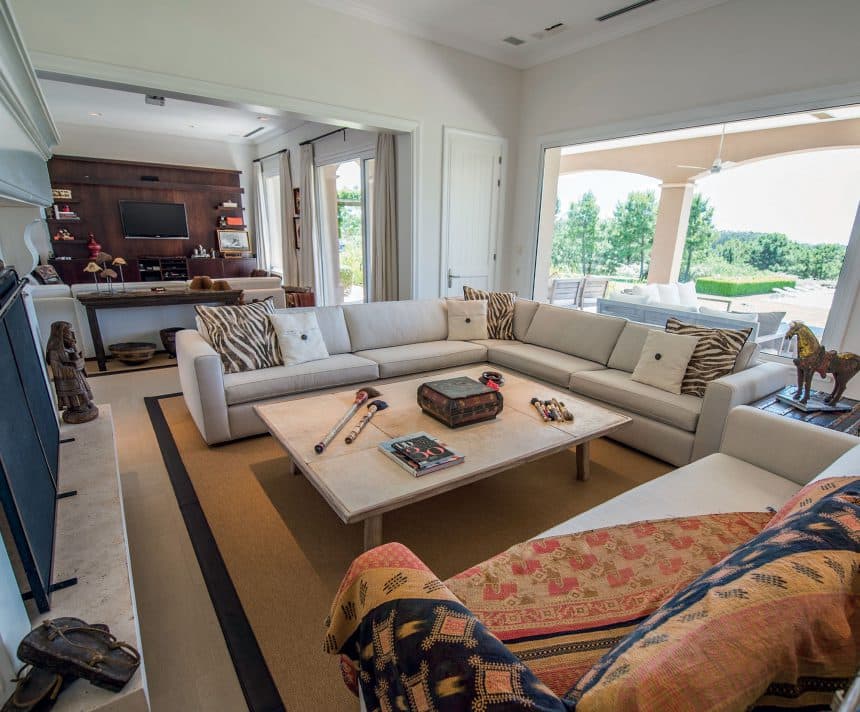 La casa principal consta de 7 suites, una master suite en el primer piso con dos baños, dos vestidores y una antecámara. Gran living comedor con chimenea, home theater, family room y dos toilettes. Amplia cocina y lavadero. El parque de exquisito refinamiento, piscina, gym, cancha de tennis con piso auto filtrante y laguna propia.