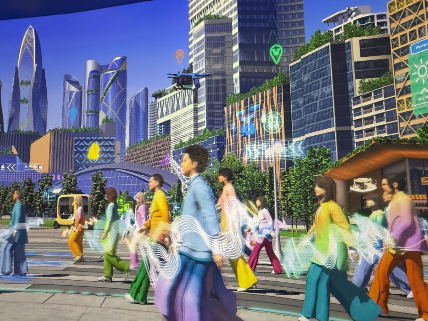 El pabellón propone una ciudad donde no hay bocinas, ni humo, ni apuro. Los árboles tienen sensores que respiran contigo. Las casas se oscurecen si estás triste, te ofrecen luz si necesitás renacer.