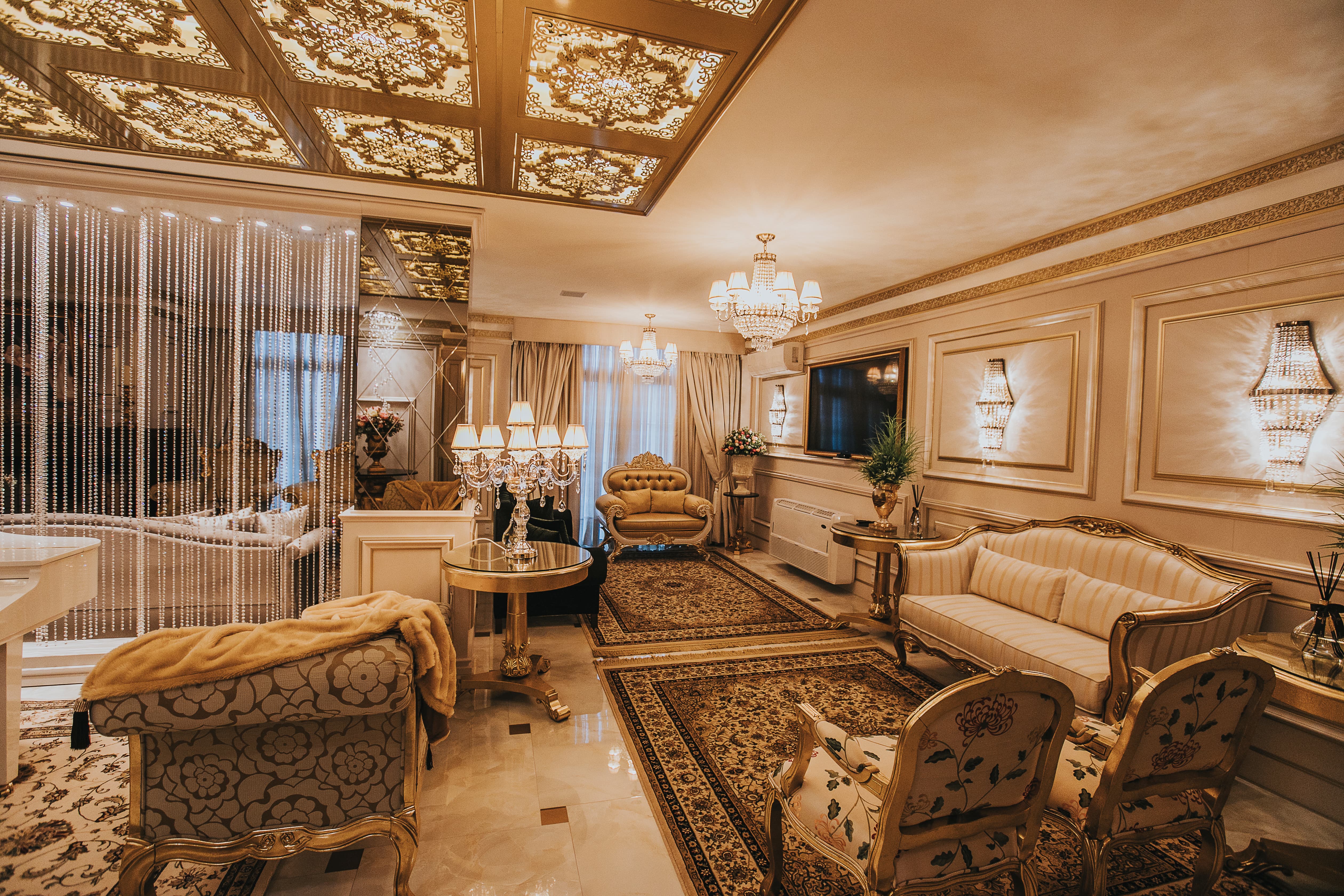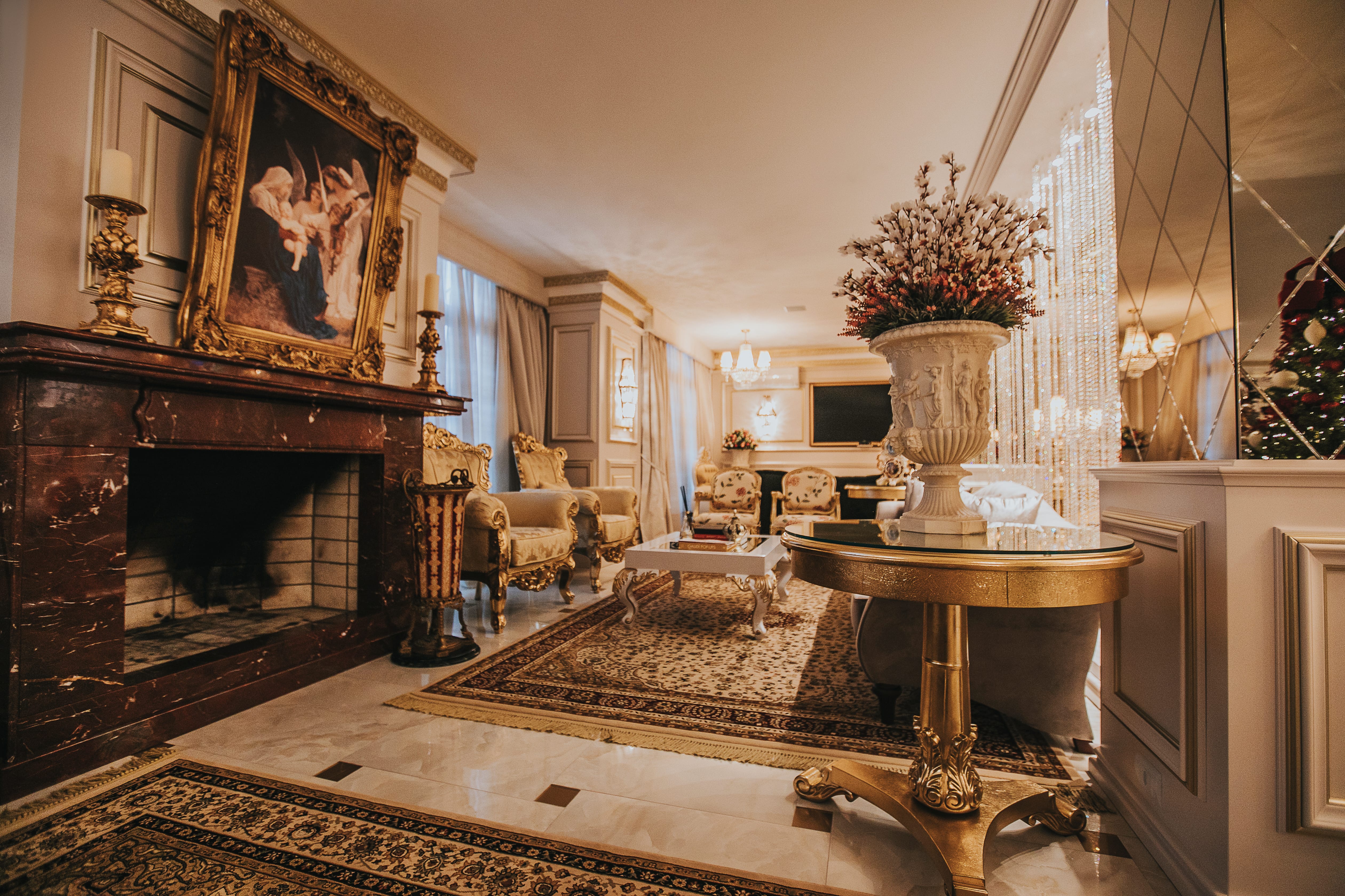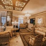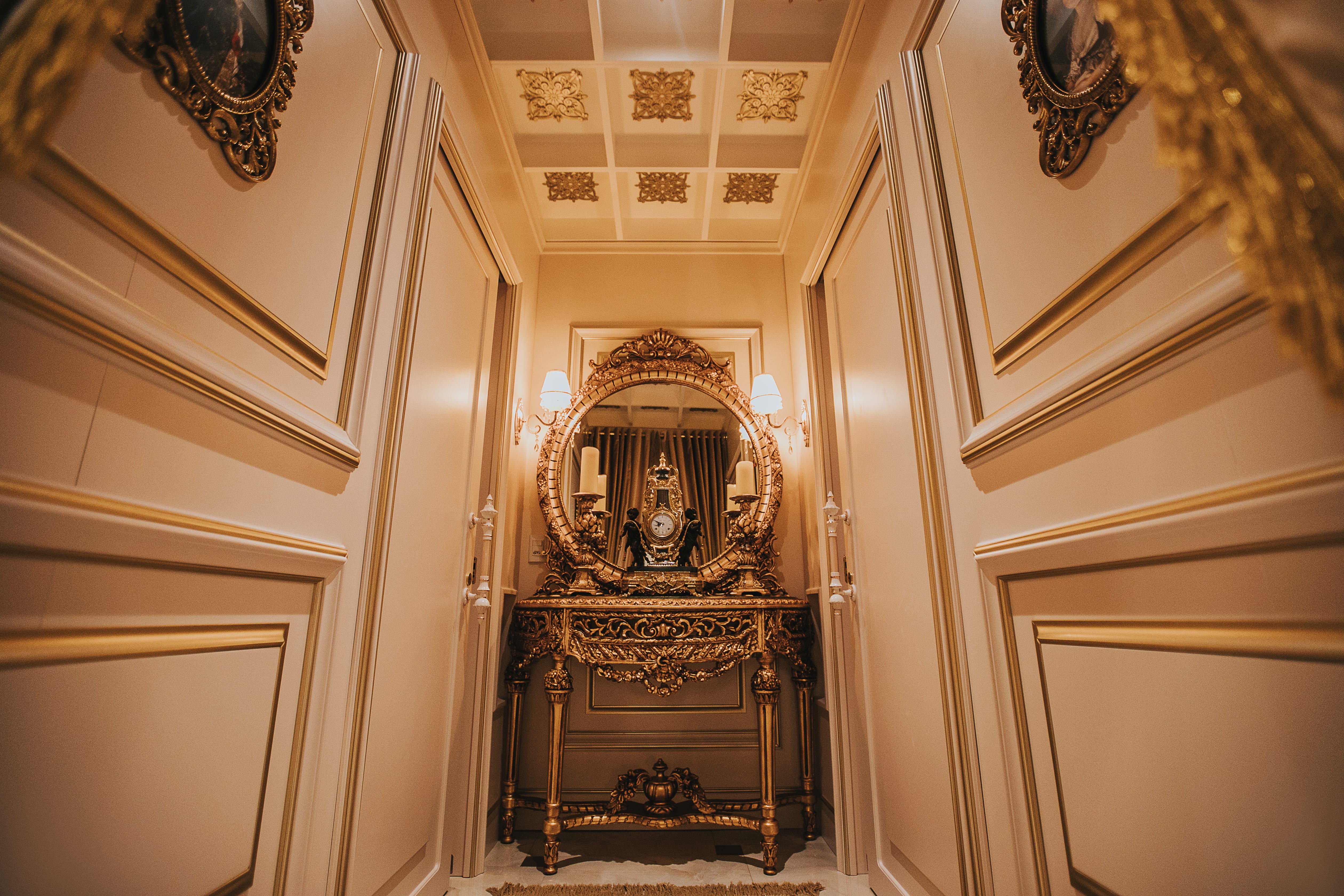 SAMRT TV 4K, cafetera NESPRESSO, con disponibilidad de tres tipos de almohadas de la línea de cama Trussardi en algodón egipcio 300 hilos, toallas 100% algodón, con muebles estilo imperial tallados a mano acompañan el equipamiento de cada suite.