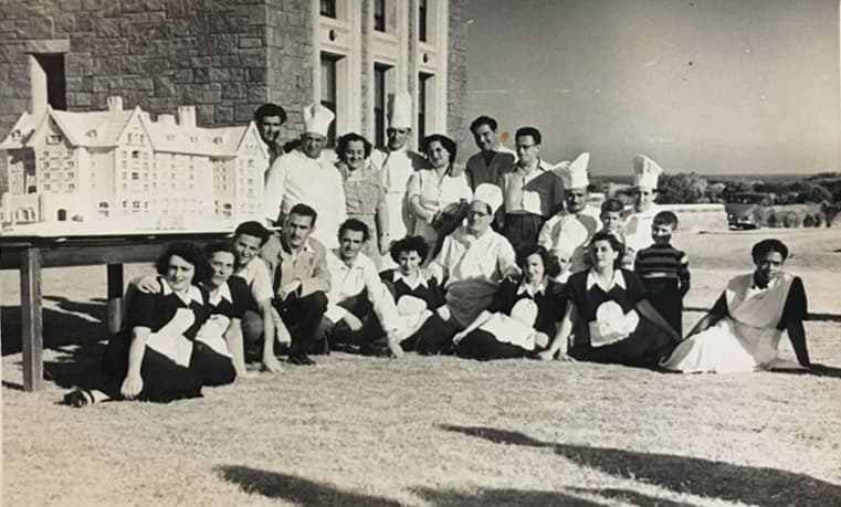 El personal del hotel el día de la inauguración posando junto a la maqueta del San Rafael hecha en azúcar y caramelo. (Foto archivo familia Bonnet).