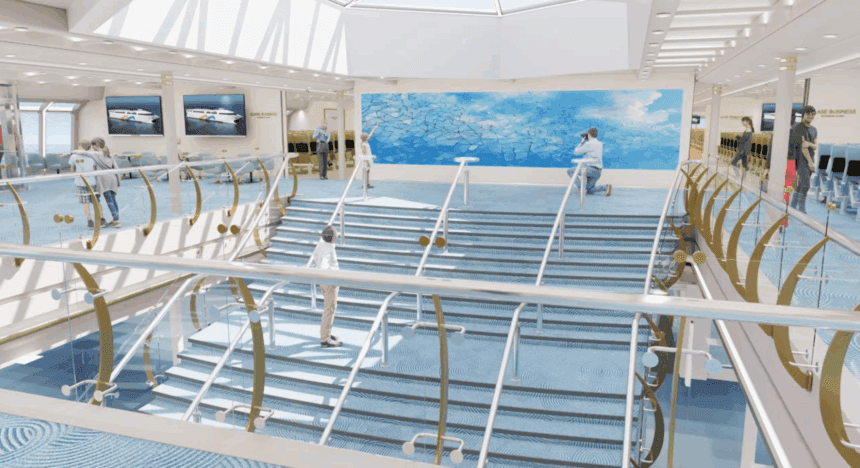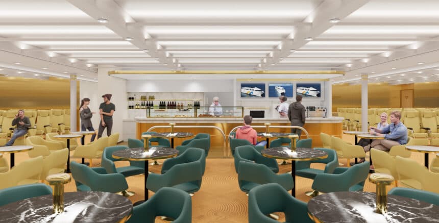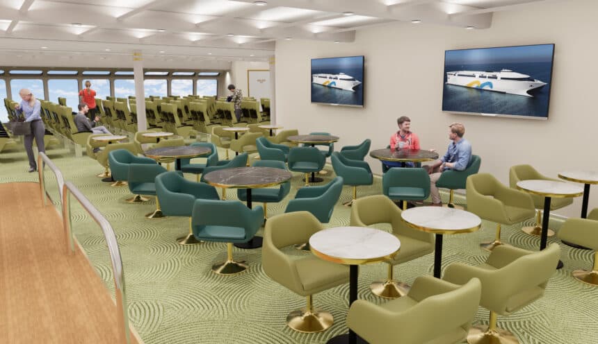 Con 3.000 m² de áreas de recreación, el ferry ofrecerá tres clases de servicio, butacas ergonómicas, dos ascensores, internet de alta velocidad y el freeshop más grande del mundo sobre el agua.