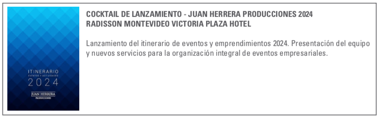 A continuación Juan Herrera Producciones tiene el agrado de presentar su itinerario de actividades para el presente 2024, gran oportunidad para publicitar asuntos referentes a empresas a través de diferentes alternativas, para difundir su marca o producto, junto a las marcas más destacadas de nuestro país.