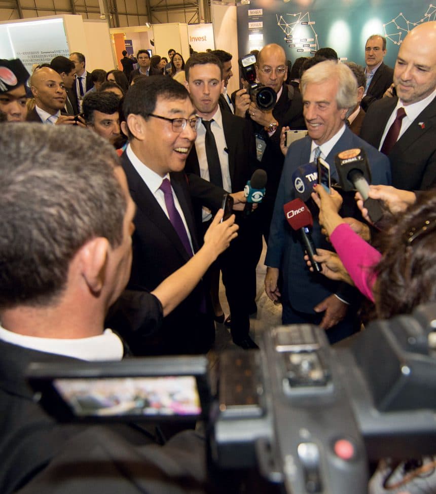 Este último presentó los casos de las empresas Lifan y Huawei y señaló la probabilidad de que la República Popular China sobrepase a EEUU como emisor de inversión extranjera directa. “(China) se está preparando para ser la economía más grande del mundo en los próximos tres años“, dijo. Tras la apertura Vázquez y Chen Zhou, vicepresidente de CCPIT, el consejo chino para la promoción del comercio internacional, recorrieron los stands nacionales de la República Popular China y Uruguay, así como el predio ferial en el que 140 empresas y organismos de 40 países exhibieron sus productos y servicios.