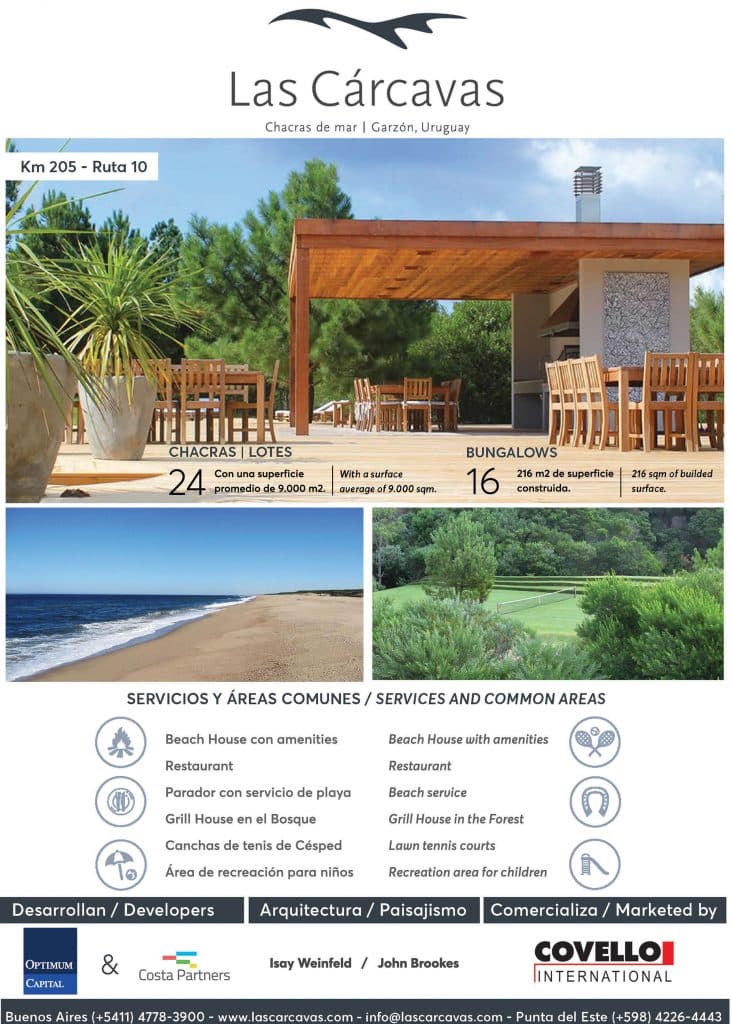 Las Cárcavas lanzará a la venta la construcción de 16 bungalows de lujo sobre el mar con una superficie de 216 metros cuadrados. Los mismos contarán con un sistema “pay per use” de house keeping y conserjería y se entregarán totalmente terminadas y equipadas bajo la modalidad “llave en mano“.