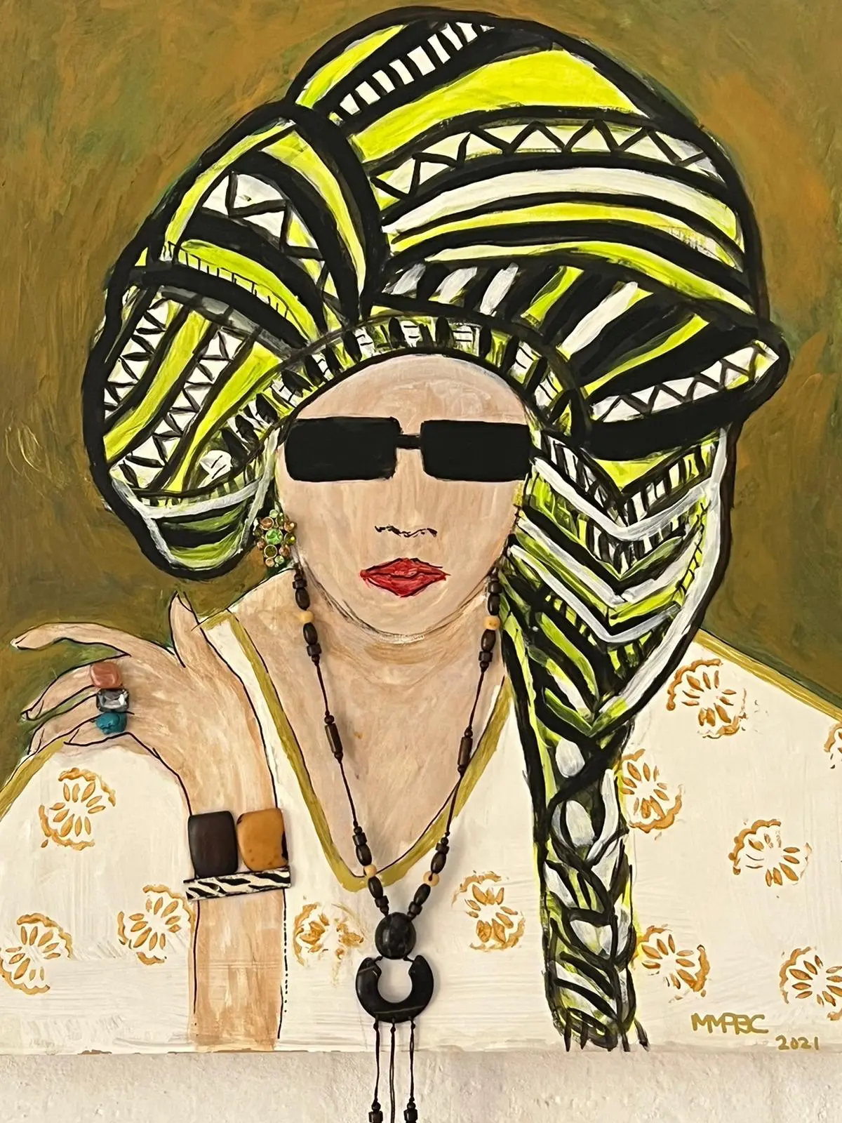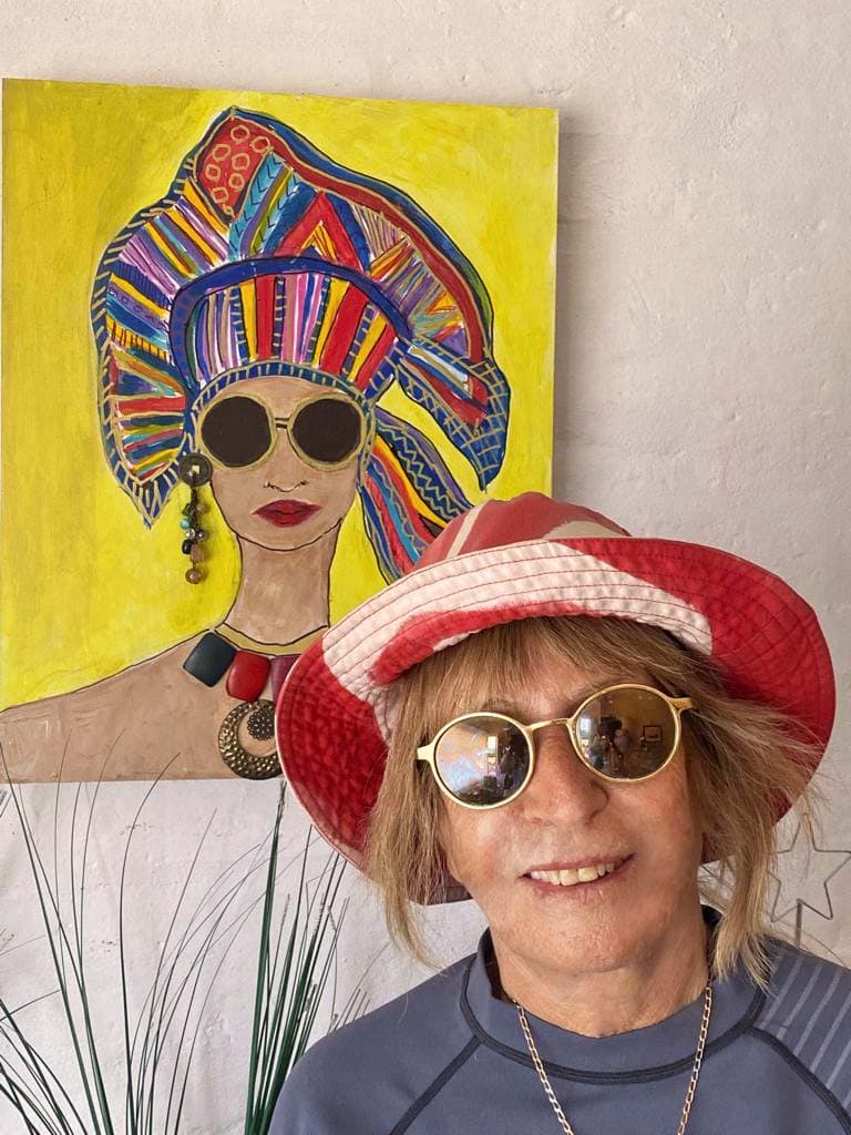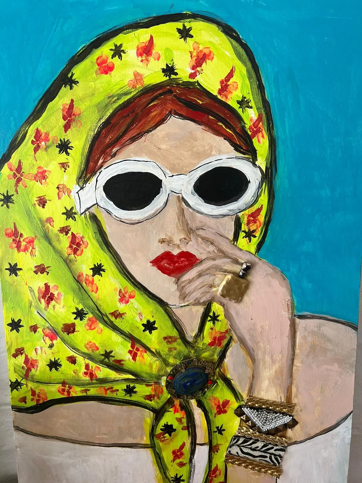 Los cuadros son trabajados con acrílicos, lo que determinan el estallido de colores y la vibración de la obra. También suelen involucrar algunos toques de collage, como los anteojos y los aros que la autora coloca en sus imágenes. De algún modo, estos pequeños roces del collage, las vuelven todavía más parte de esta realidad, las traen desde la pintura a este mundo convulsionado y tumultuoso en el que vivimos.