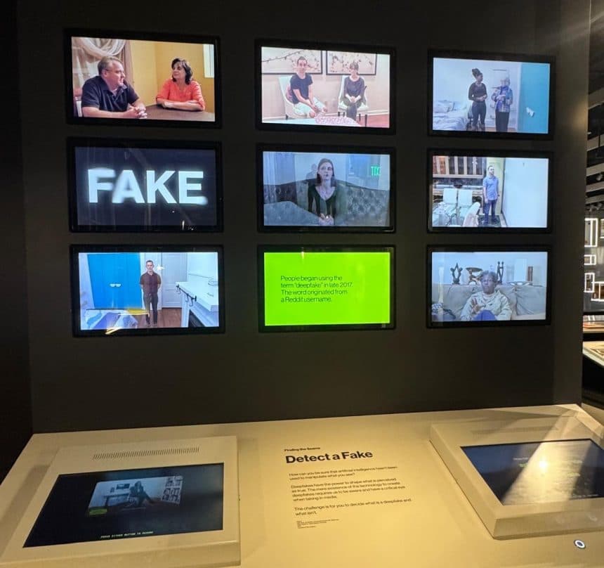 Uno de los espacios más reveladores del museo fue el dedicado a los deepfakes. Imágenes, voces, videos generados por inteligencia artificial que desafían nuestra percepción de la realidad. En una galería que parece salida del futuro, aprendimos a reconocer lo real de lo artificial. A detectar la trampa visual, el audio editado, el engaño invisible.