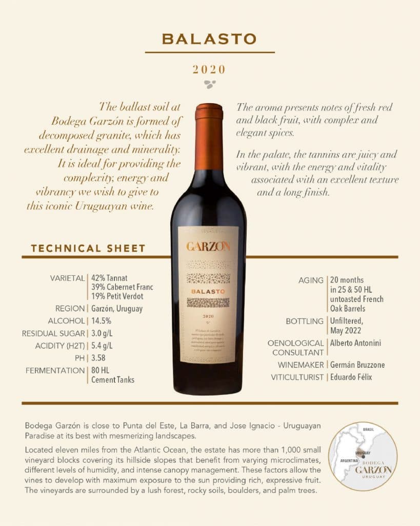 Celebrando este lanzamiento de Balasto 2020 en el mundo, el próximo sábado 16 de setiembre realizaremos un exclusivo evento en el restaurante de Bodega Garzón donde los presentes podrán disfrutar de un almuerzo preparado especialmente para la ocasión acompañado de Balasto 2020 y una selección de otros vinos junto a nuestro sommelier.