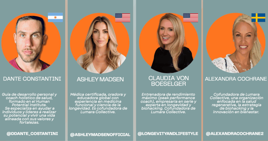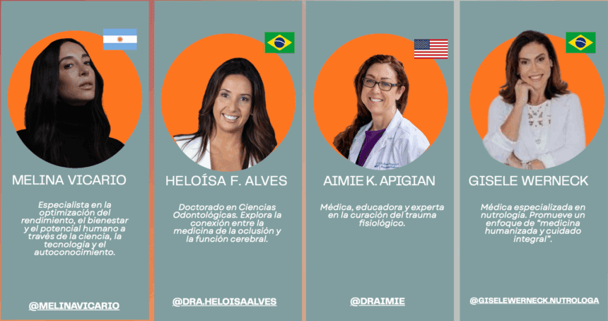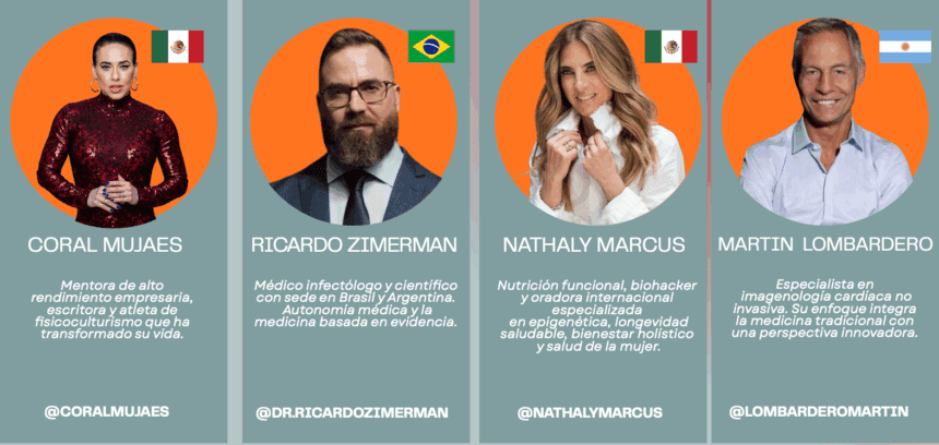 La grilla de speakers refleja el carácter global y multidisciplinario del encuentro. Participan referentes como Nathaly Marcus, especialista en nutrición funcional y epigenética; Ricardo Zimerman, médico infectólogo y divulgador científico; Martin Lombardero, especialista en imagenología cardíaca; y Coral Mujaes, mentora de alto rendimiento, entre otros profesionales de América Latina, Estados Unidos y Europa.
