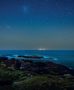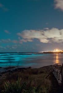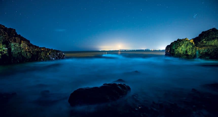 En algunas noches, el mar se tiñe de colores: un azul eléctrico y destellos rojizos son el gran espectáculo ofrecido por distintas especies de microorganismos que visten de gala la noche esteña.