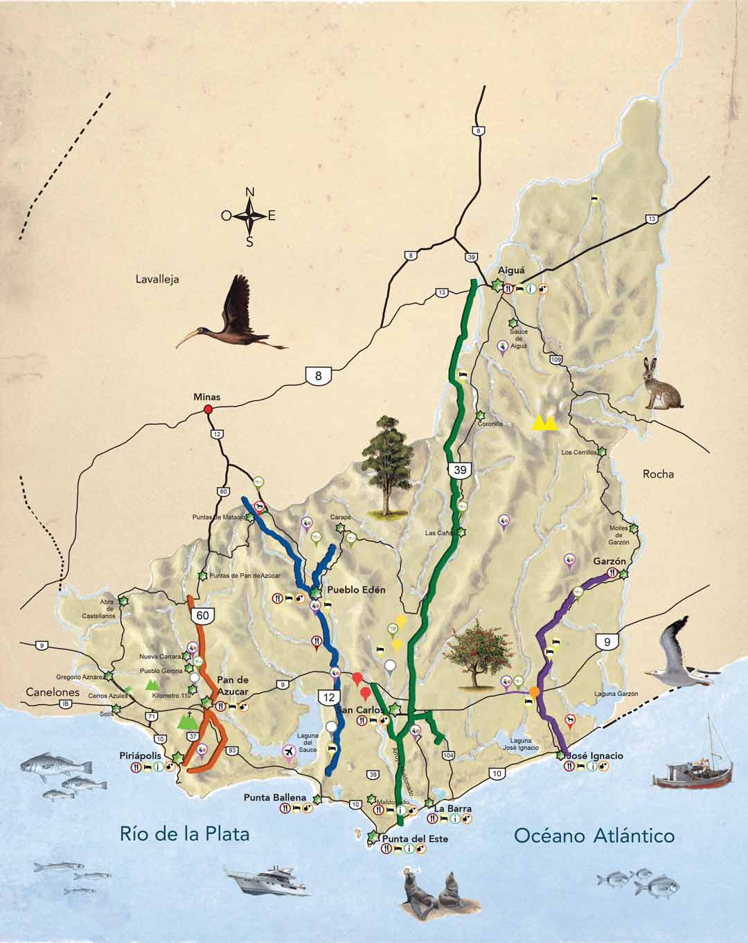 La Ruta 12 lleva a las alturas. Desde Punta Ballena hasta las Sierras de Maldonado y Lavalleja, el camino está salpicado por hermosas chacras, almazaras y pequeñas bodegas boutique. Aquí se encuentran la Bodega t -Ruta 12, km 26-, Bodega Alto de la Ballena -Ruta 12, km 12.4-, Almazara Lote 8 -Ruta 12, Pje. Dos Hermanos-, Almazara Finca Babieca -Ruta 12, Sierra de los Caracoles-, El Sabiá -Ruta 12, km 357. Después del recorrido y la degustación de aceites y vinos, se puede hacer un alto en alguno de los pintorescos hoteles como Las Cumbres, La Holandesa, La Posta de Vaimaca, entre otros.