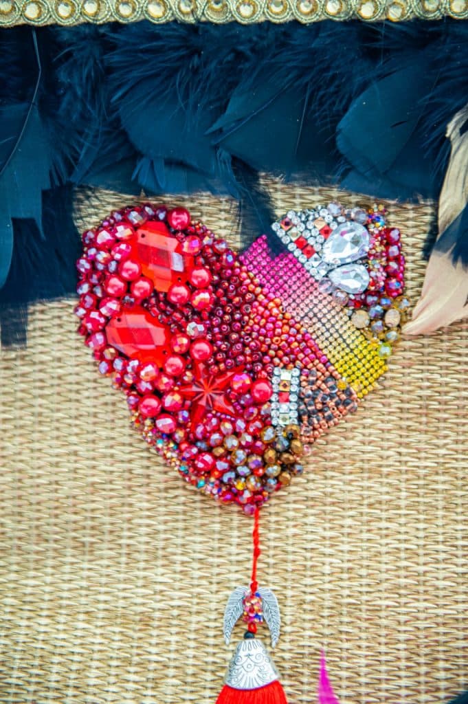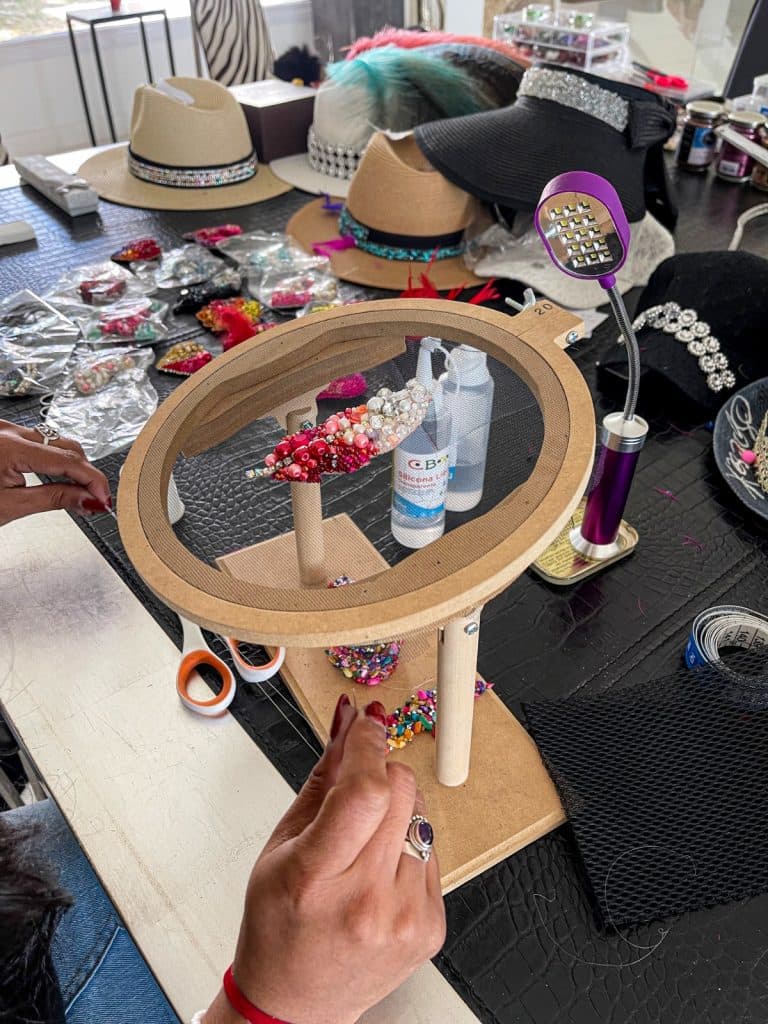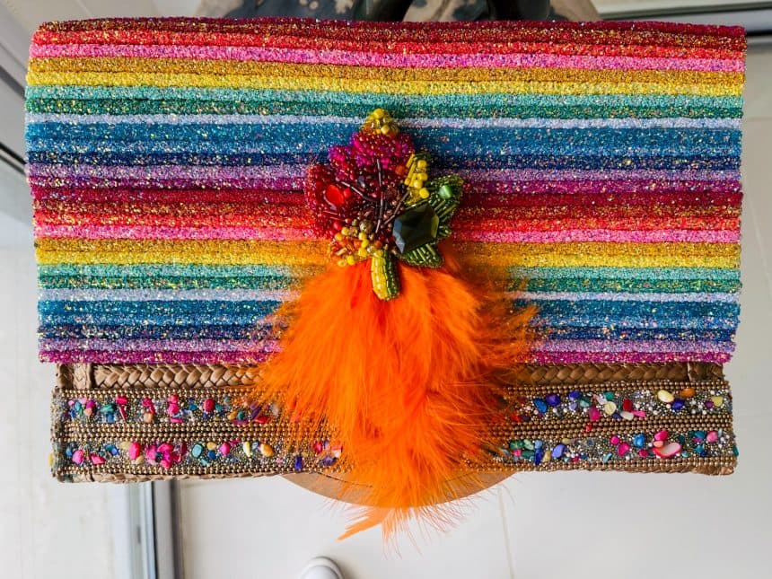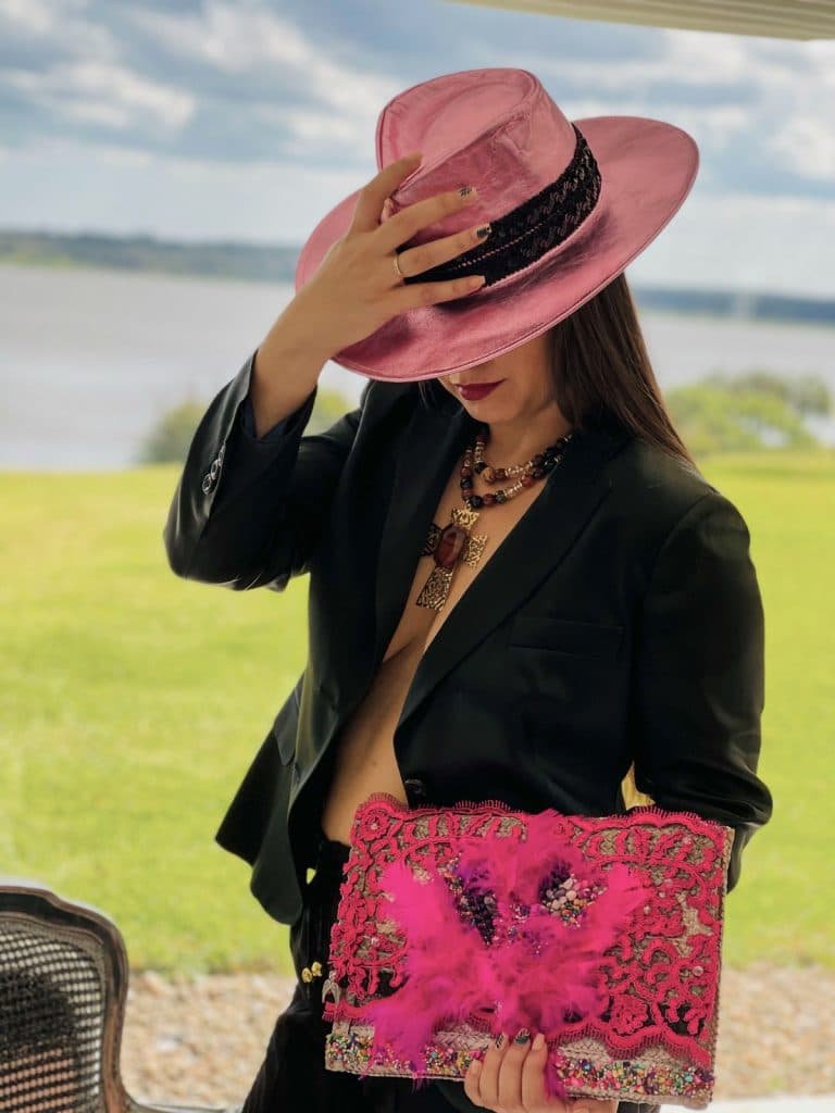 Los bolsos y sombreros de Kursner son piezas únicas con plumas y brillos de todos los colores. “Se trata de ediciones limitadas, ninguno se repite ni en los colores ni en sus formas. Los sombreros, además, se pueden guardar en la valija y cuidan el peinado”, dice.