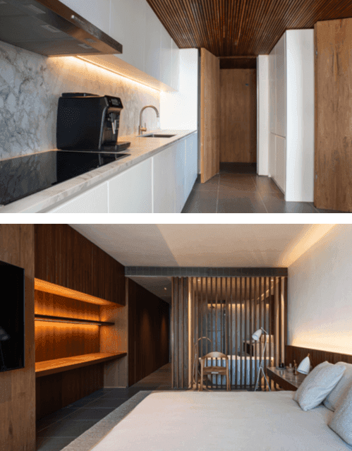 El edificio ofrece amenities que acompañan ese espíritu: un gimnasio de última generación con salas de yoga y meditación; piscina cubierta de travertino climatizada semiolímpica de 25 metros con luz natural; piscina exterior; spa con sauna, vapor, hidromasajes y salas de masajes; lounge y un shop curado con la misma elegancia del proyecto.