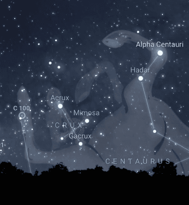 El cielo del barrio, mirando al sur. A las 21:30, la bóveda nocturna revela su mapa más austral: la Cruz del Sur se alza justo al frente, mientras Alpha Centauri, la estrella más próxima a nuestro sistema solar, brilla un poco más hacia el oeste, como una vecina silenciosa del infinito.