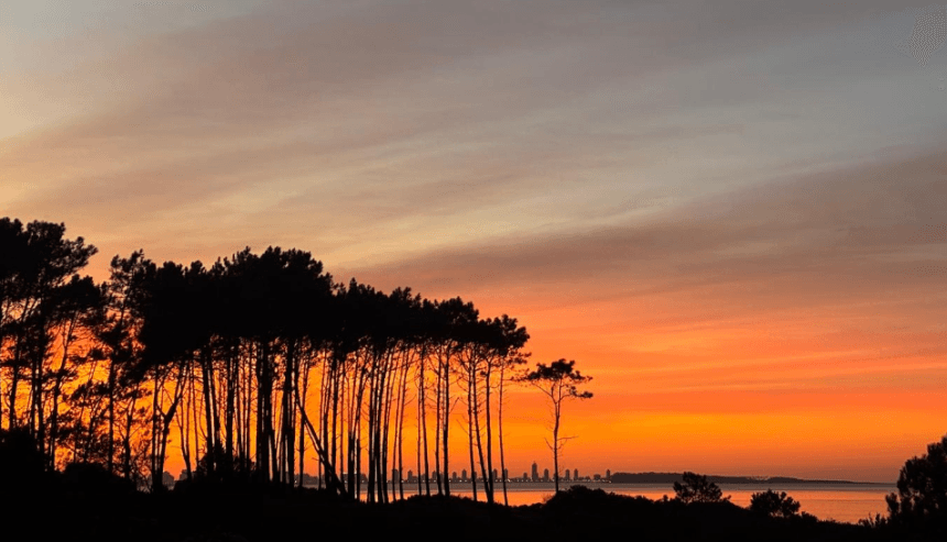 Por las mañanas, el sol nace detrás del skyline de Punta del Este, tiñendo las aguas de luz rosada.